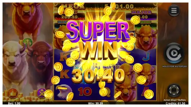 Played on 5 reels and 4 rows, Action Ways™ Buffalo delivers 1024–2400 ways to win. The absence of fixed paylines allows symbols to connect freely across adjacent reels. Diamond Wilds appear only on the middle reels, increasing win potential without dominating gameplay.